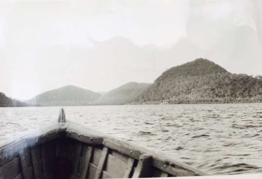 When I recovered this old photograph a few years ago I wanted to paint an image from it.The slightly choppy waters became the marker of a storm. The still, slightly hazy sky to the north turned into wild clouds. Was this a body-memory of how I felt that day, far out on the river? How different the river feels today: tidy, organised, wharfs and pontoons to land on, clean neat houses. Same mountains in the distance, though. The drone view is not possible from one’s own body, unless one is paragliding or going up to heaven.